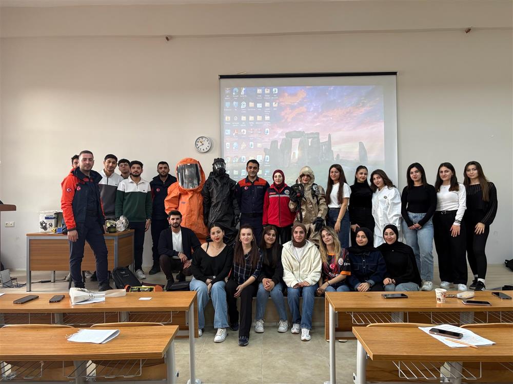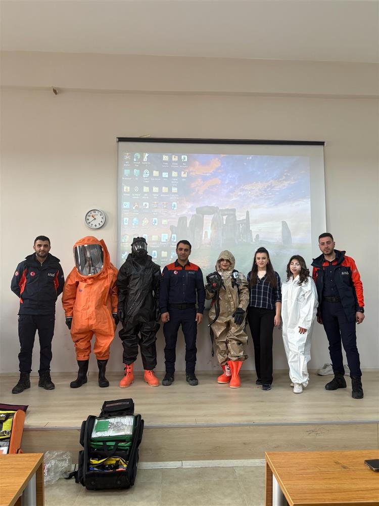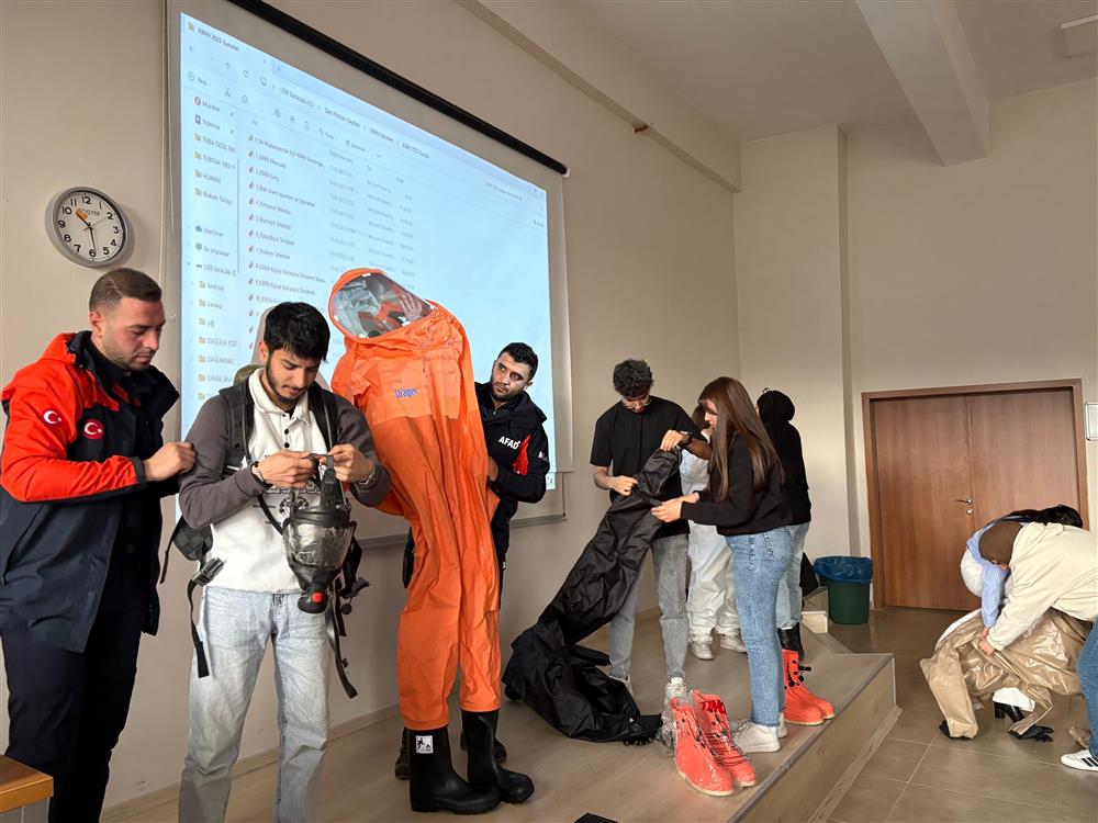 Program çerçevesinde ayrıca, KBRN olaylarında kullanılan kişisel koruyucu ekipmanların (KKE) doğru kullanımı uygulamalı olarak gösterildi. Öğrenciler, koruyucu ekipmanların giyilmesi ve çıkarılması süreçlerini birebir deneyimleme fırsatı buldu. Bu sayede olası bir afet veya acil durumda bilinçli ve hızlı hareket edebilme yetkinliklerinin artırılması hedeflendi.